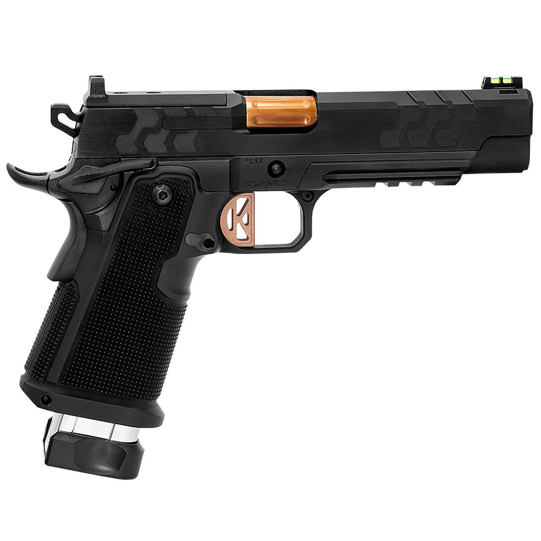KIMBER 2K11 OR 45ACP 13RD 5″ FLUTED & RAMPED HIGHLY POLISHED W/ COYOTE PVD BARREL; CUSTOM FRONT & REAR SLIDE SERRATIONS; BRUSH POLISH FLATS W/ DLC COATING; TAG PRECISION FIBERLOK 2 FRONT SIGHT; PICATINNY RAIL; 3 X 13RD MAGS